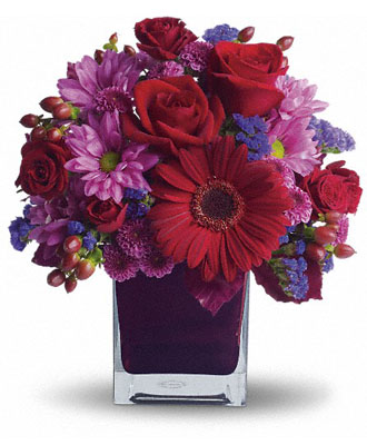 Do you believe that parties and flowers go hand in hand? We certainly do! If you're looking to decorate your party venue or give a special gift, then the It is My Party by Teleflora floral arrangement is the perfect choice. This stunning bouquet is a beautiful blend of burgundy and plum hues, featuring gorgeous plum statice and lavender chrysanthemums complemented by ruby red roses, gerberas, and hypericum. These vibrant colors represent love, passion, and enthusiasm, making it the perfect way to kick off any celebration. Additionally, the bouquet includes lavender statice, which signifies remembrance, and cherry red hypericum, representing joy and cheerfulness. The dark red and crimson roses symbolize warmth and affection, while the lilac-hued chrysanthemums are a toast to a long, happy, and healthy life.